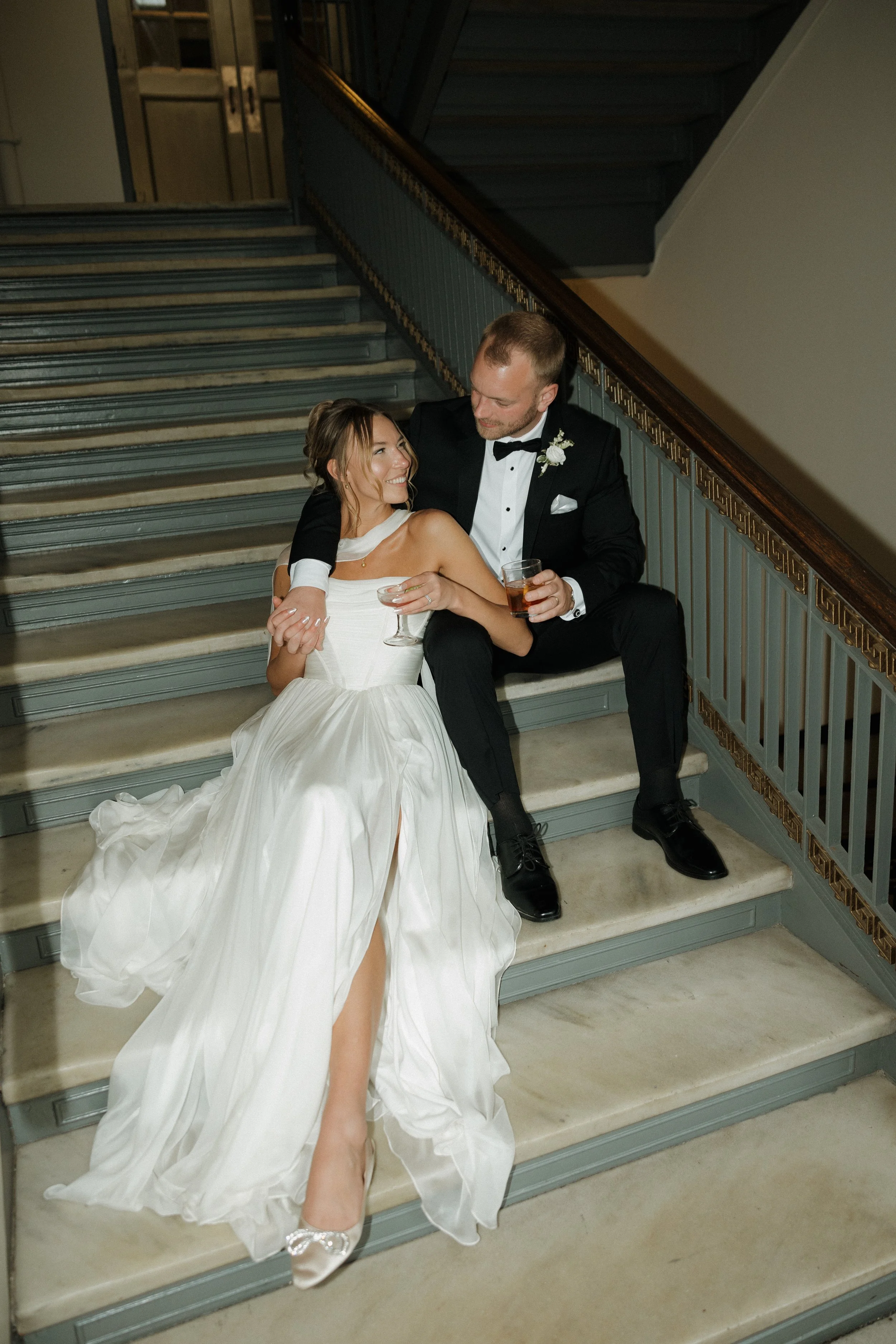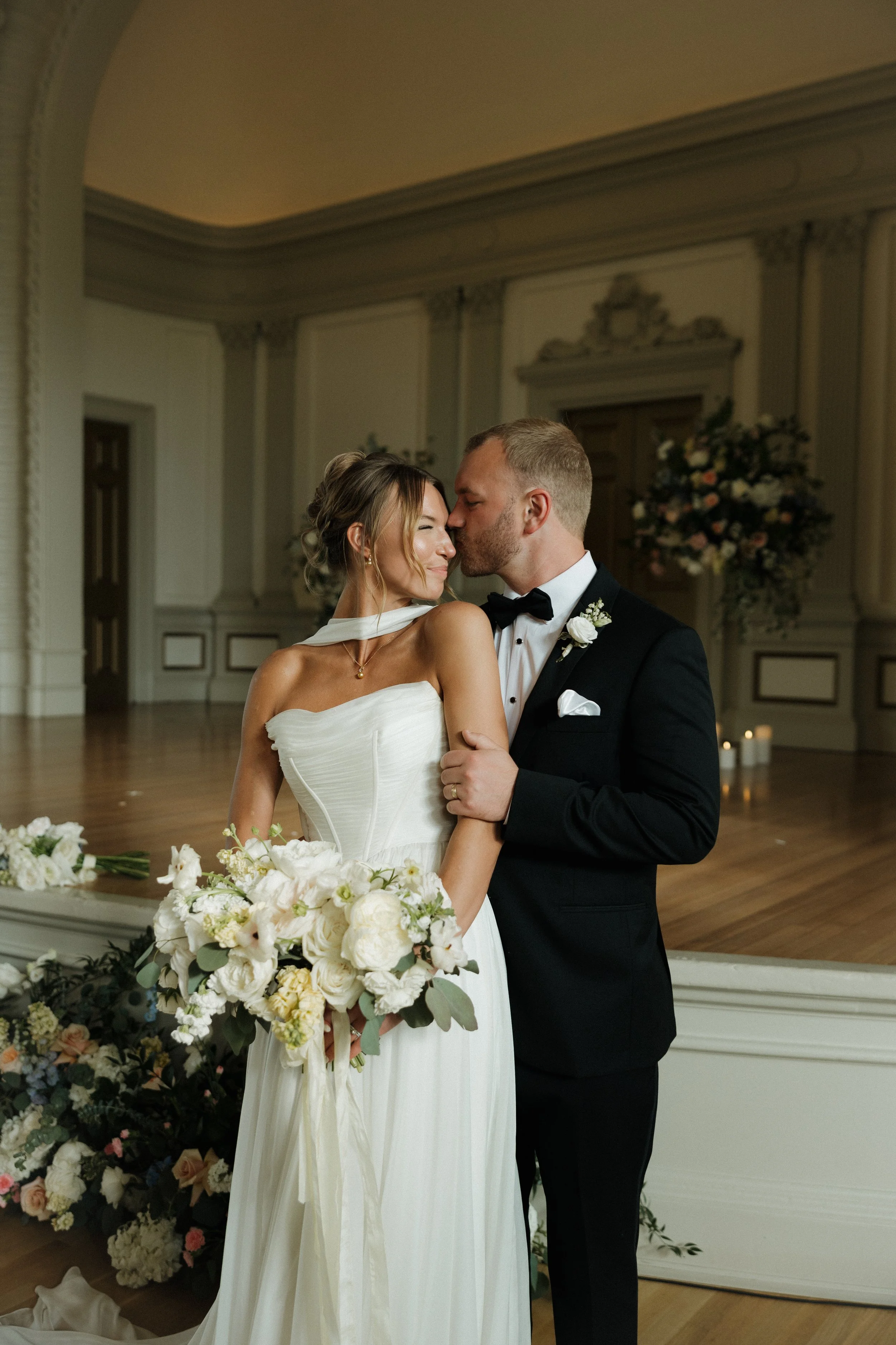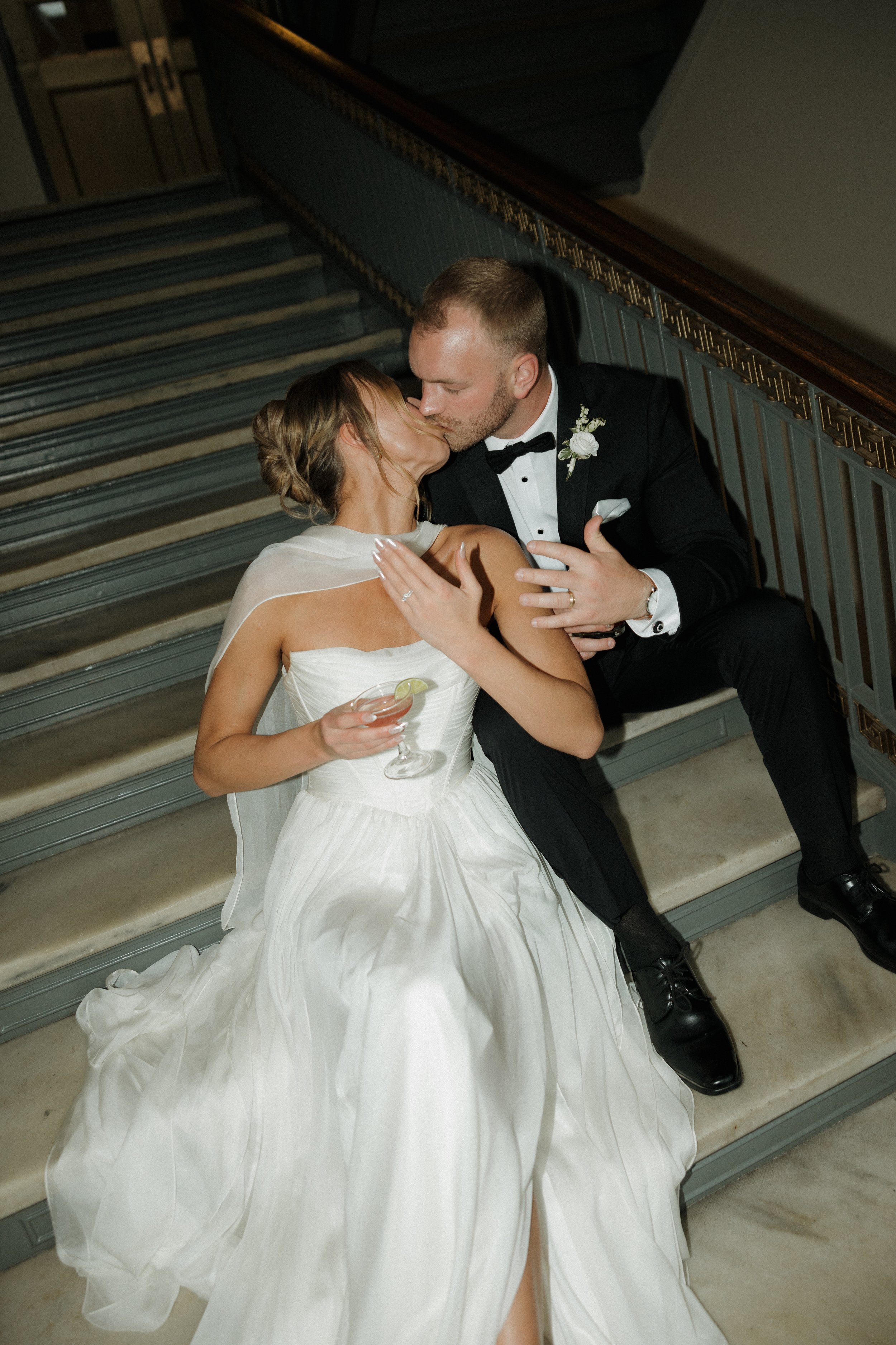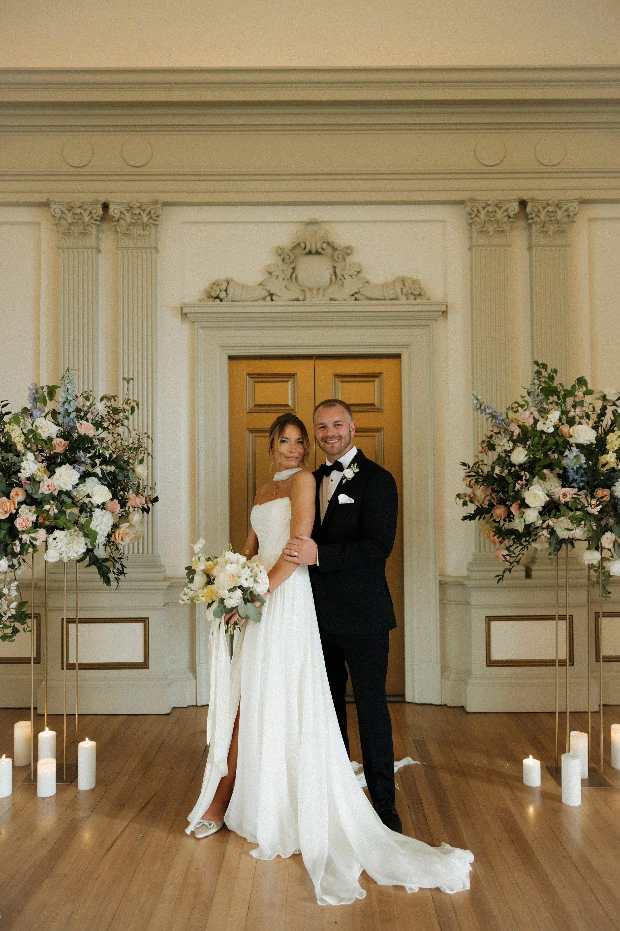 Their ceremony took place in the stately Ballroom at The Stephens School. Soaring ceilings and architectural details lent a sense of reverence; curated florals softened the space and brought the outdoors in. When they were announced husband and wife and shared their first kiss, the room erupted in joy.
