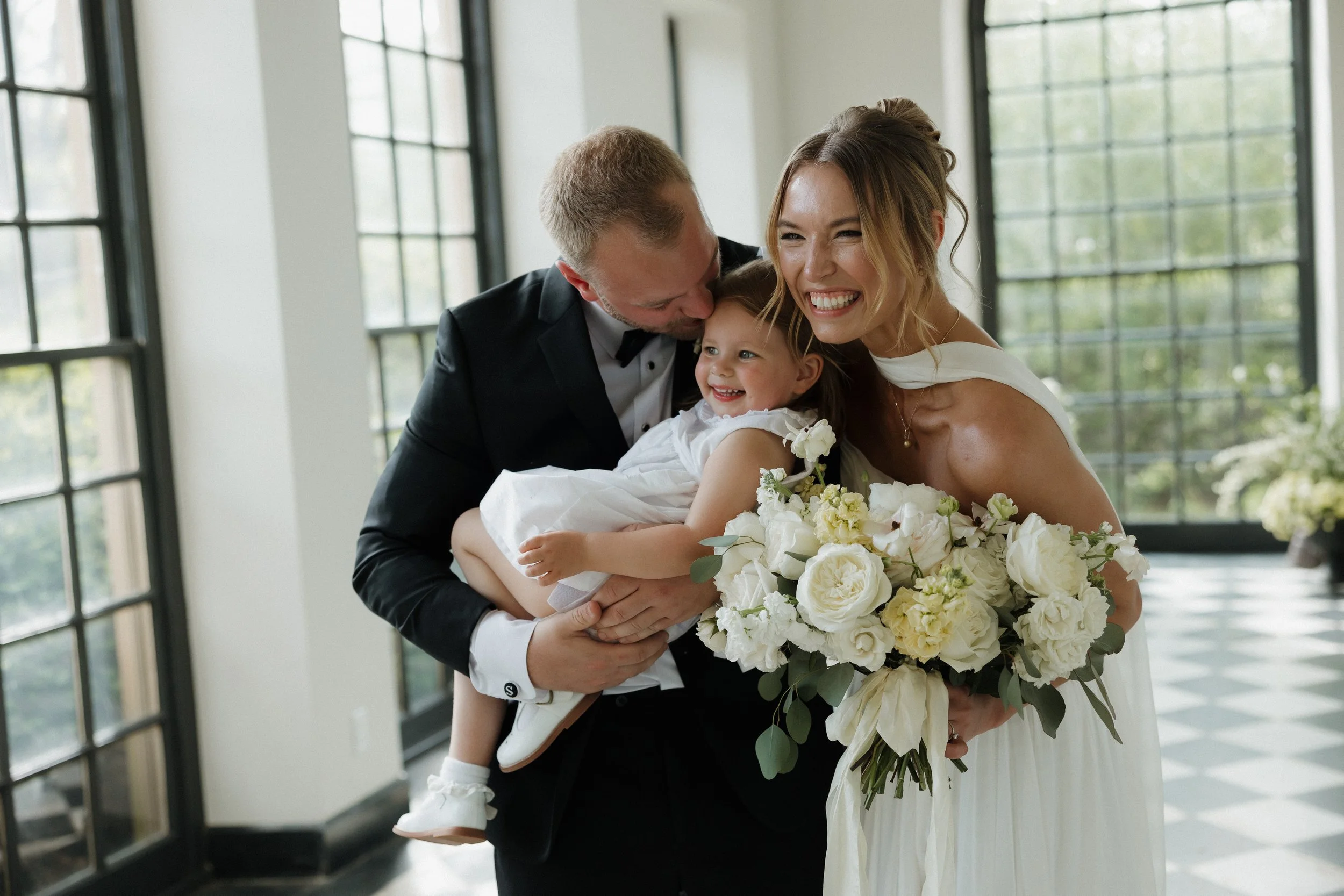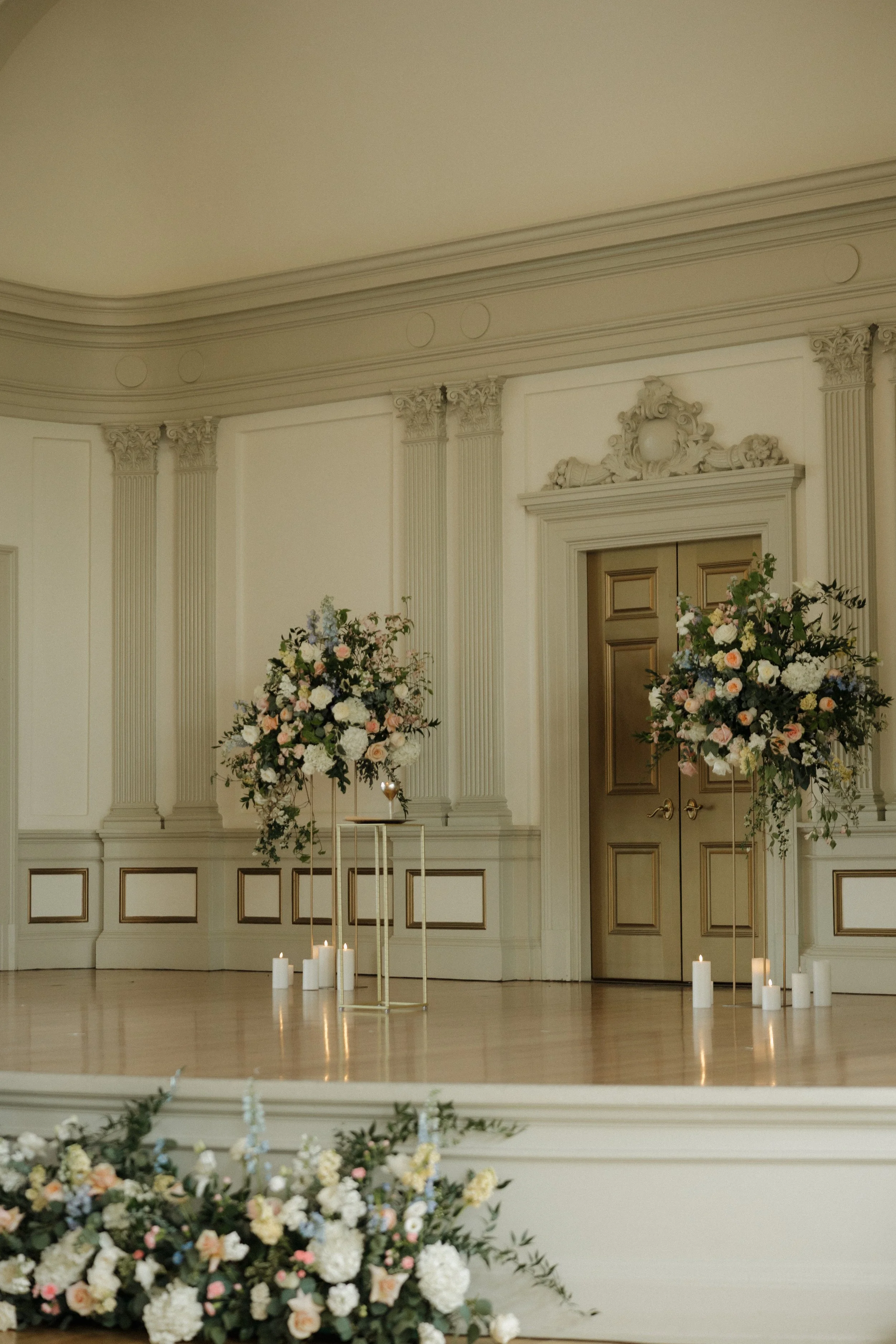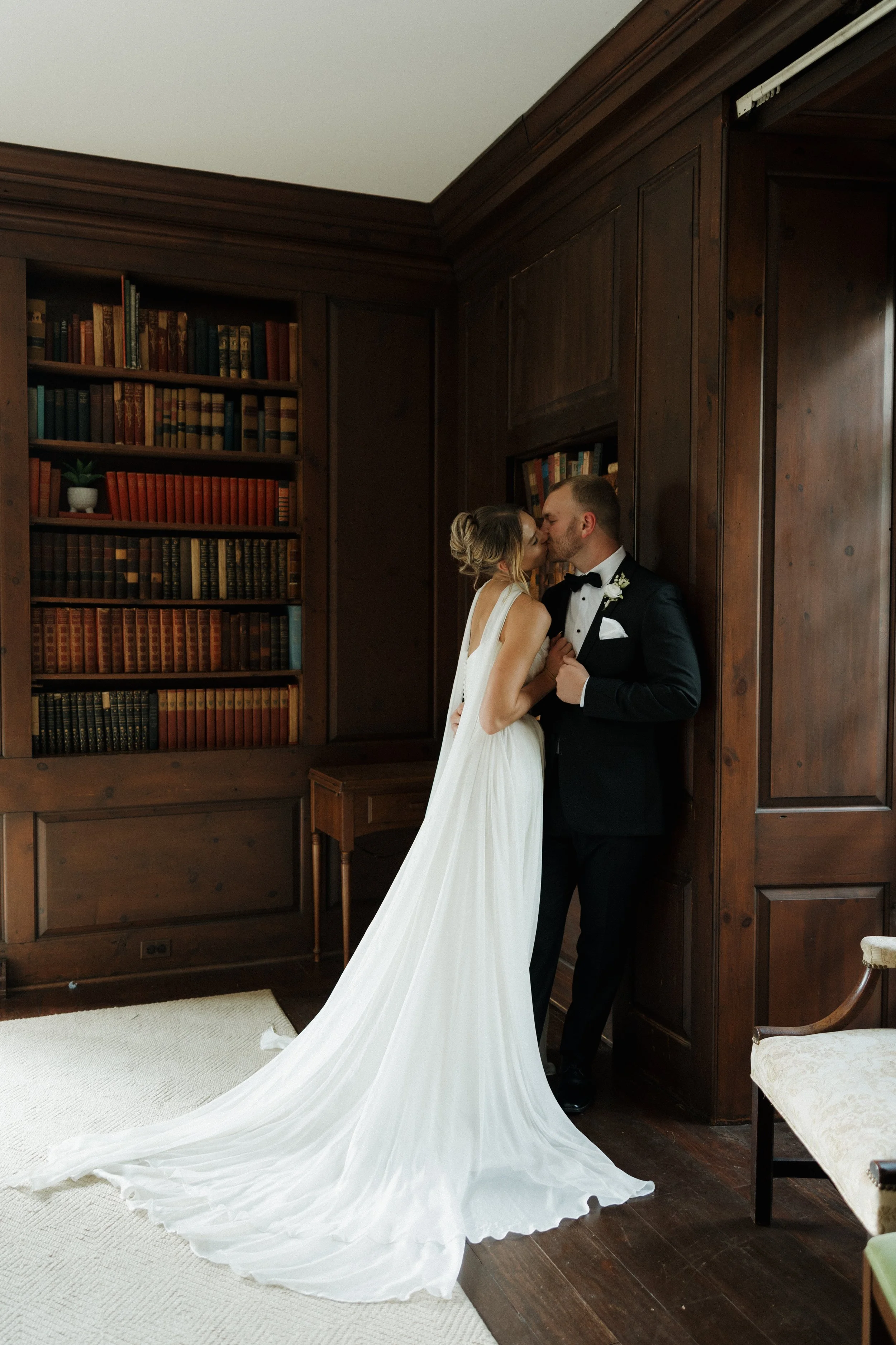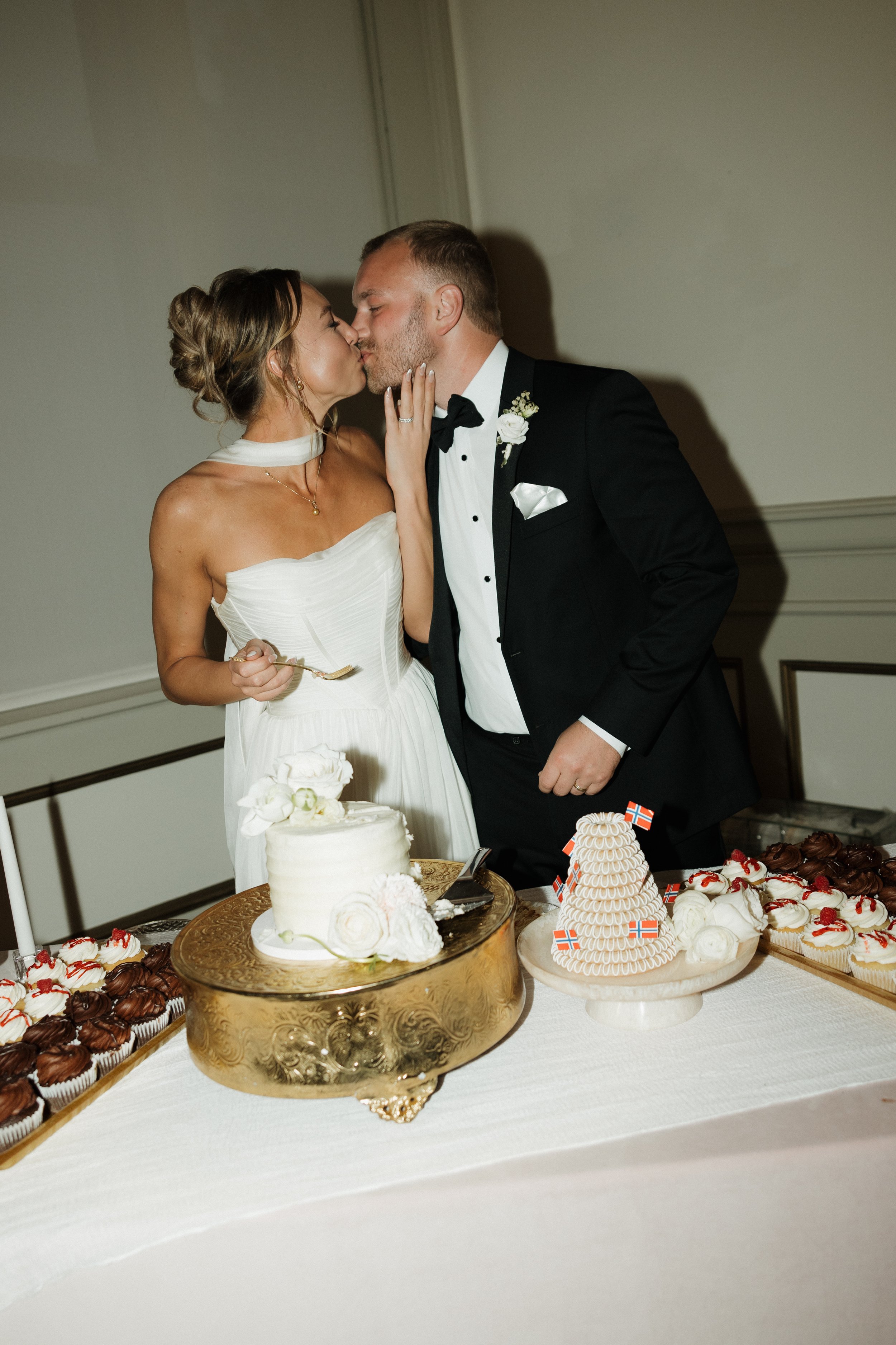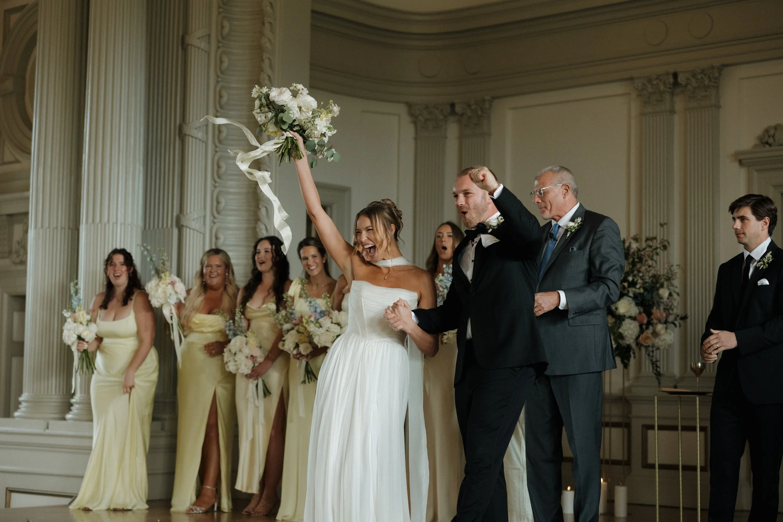 Their ceremony took place in the stately Ballroom at The Stephens School. Soaring ceilings and architectural details lent a sense of reverence; curated florals softened the space and brought the outdoors in. When they were announced husband and wife and shared their first kiss, the room erupted in joy.