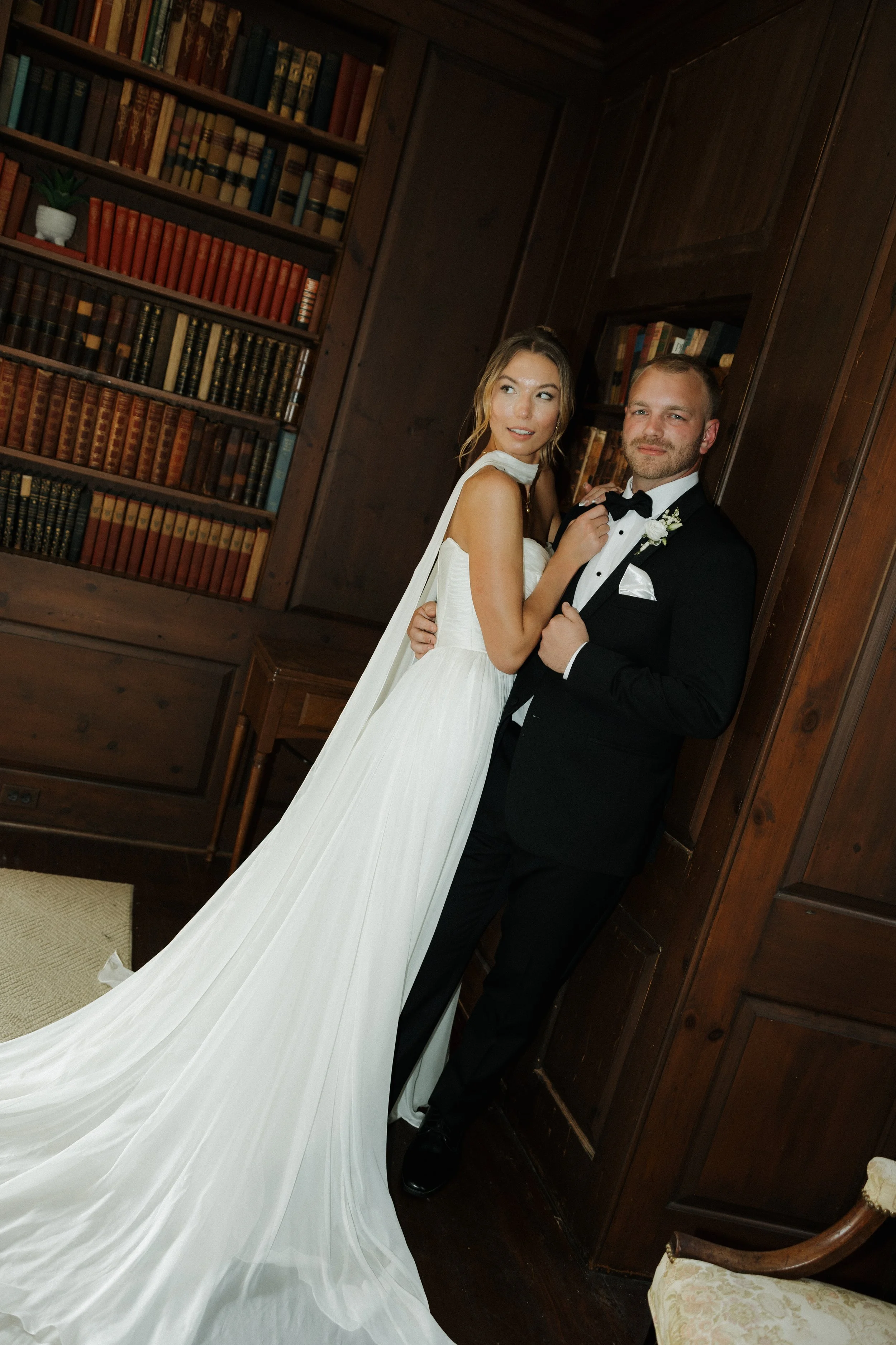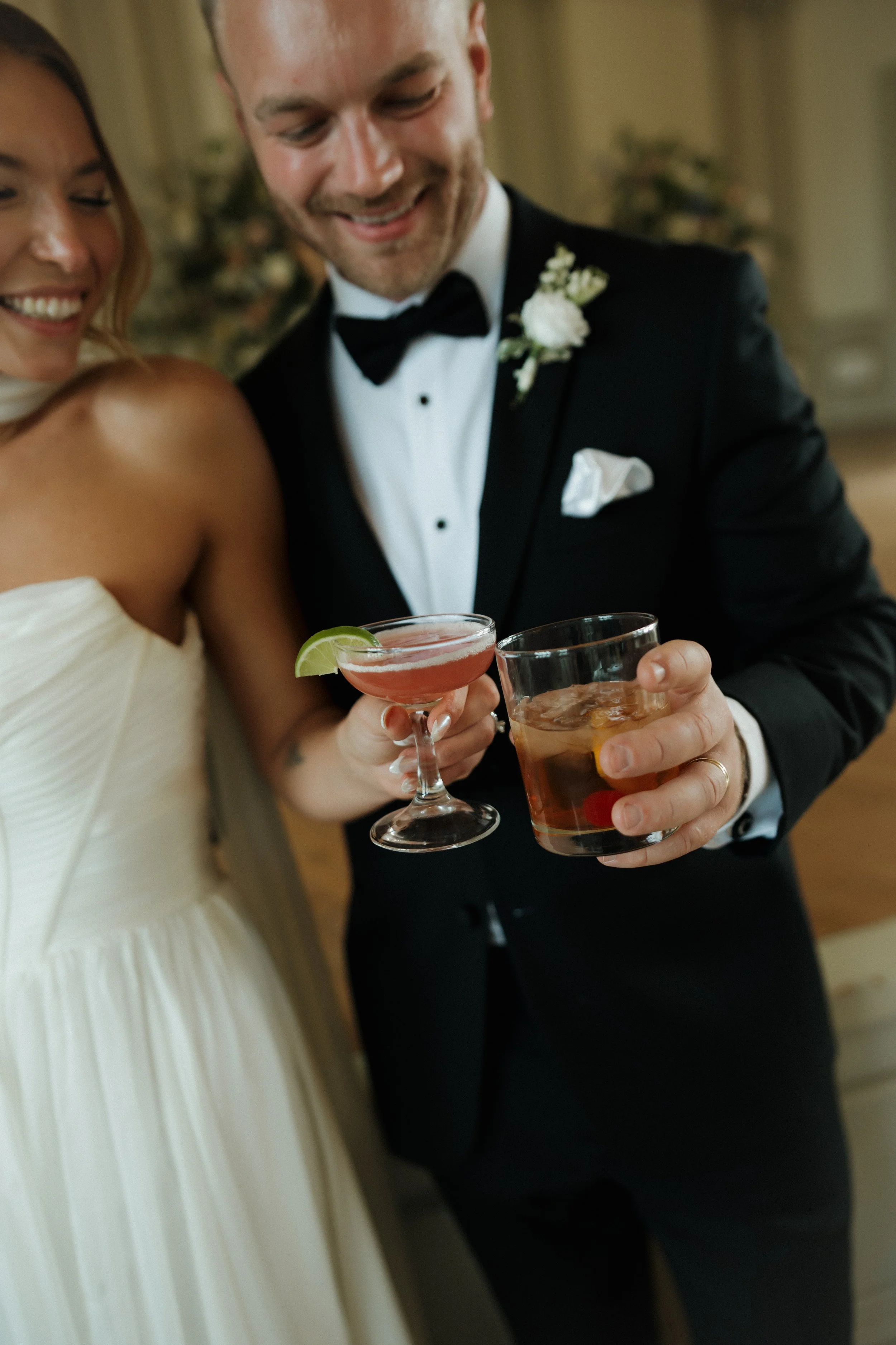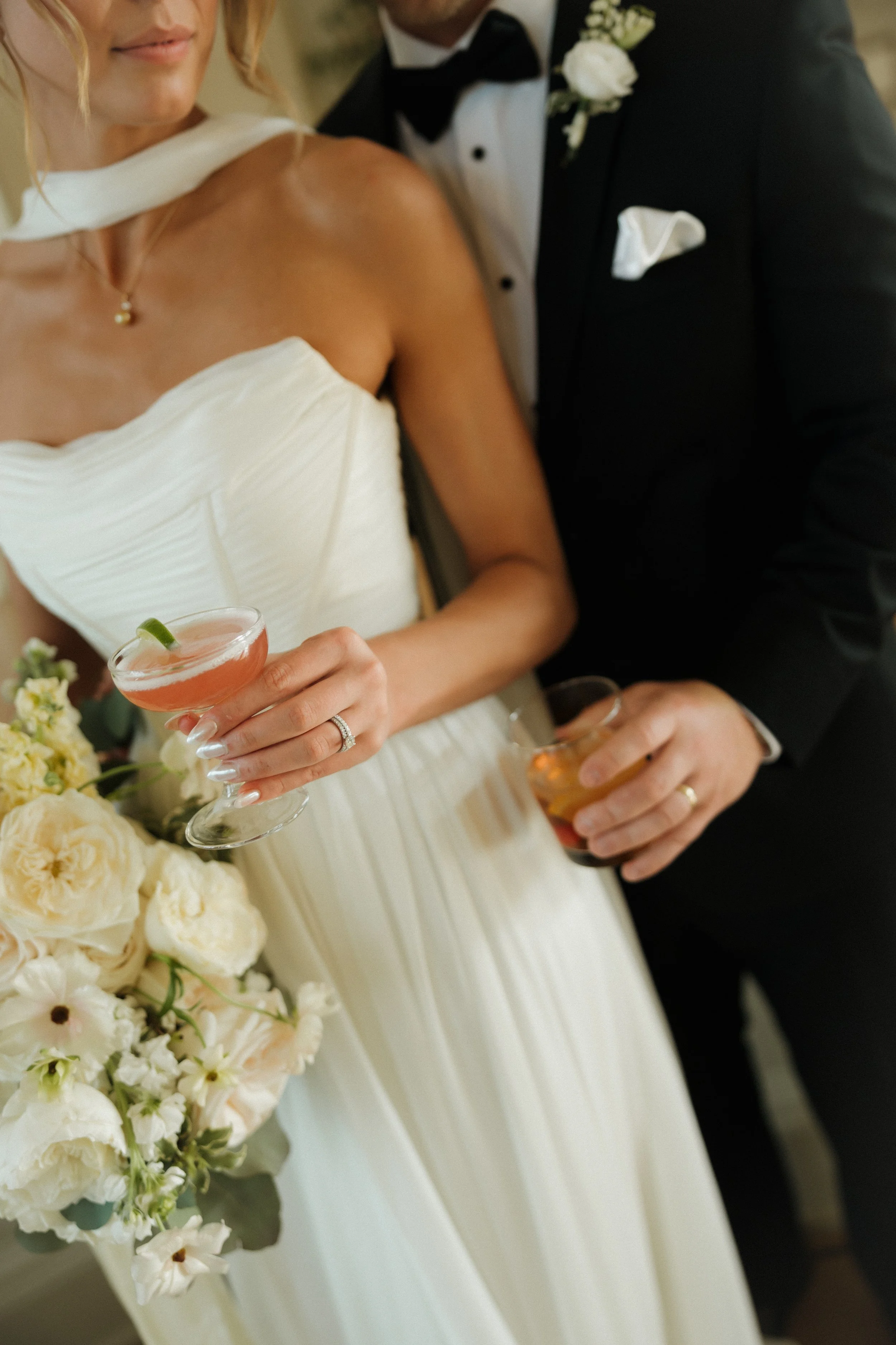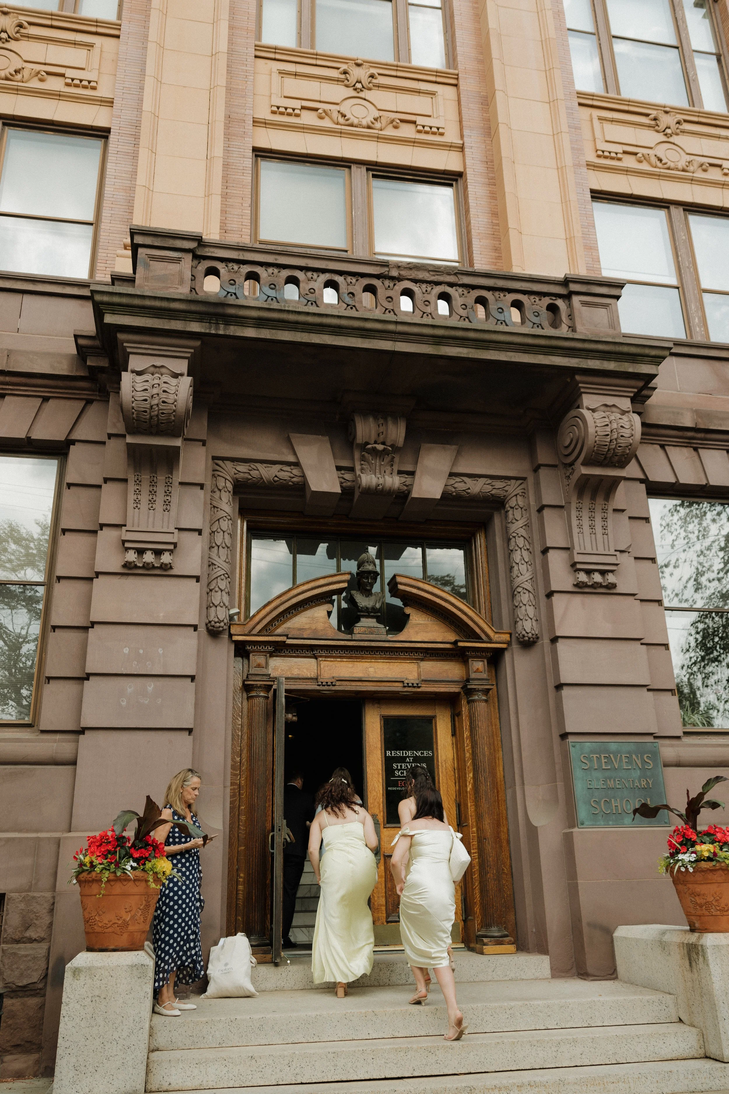 Their ceremony took place in the stately Ballroom at The Stephens School. Soaring ceilings and architectural details lent a sense of reverence; curated florals softened the space and brought the outdoors in. When they were announced husband and wife and shared their first kiss, the room erupted in joy.