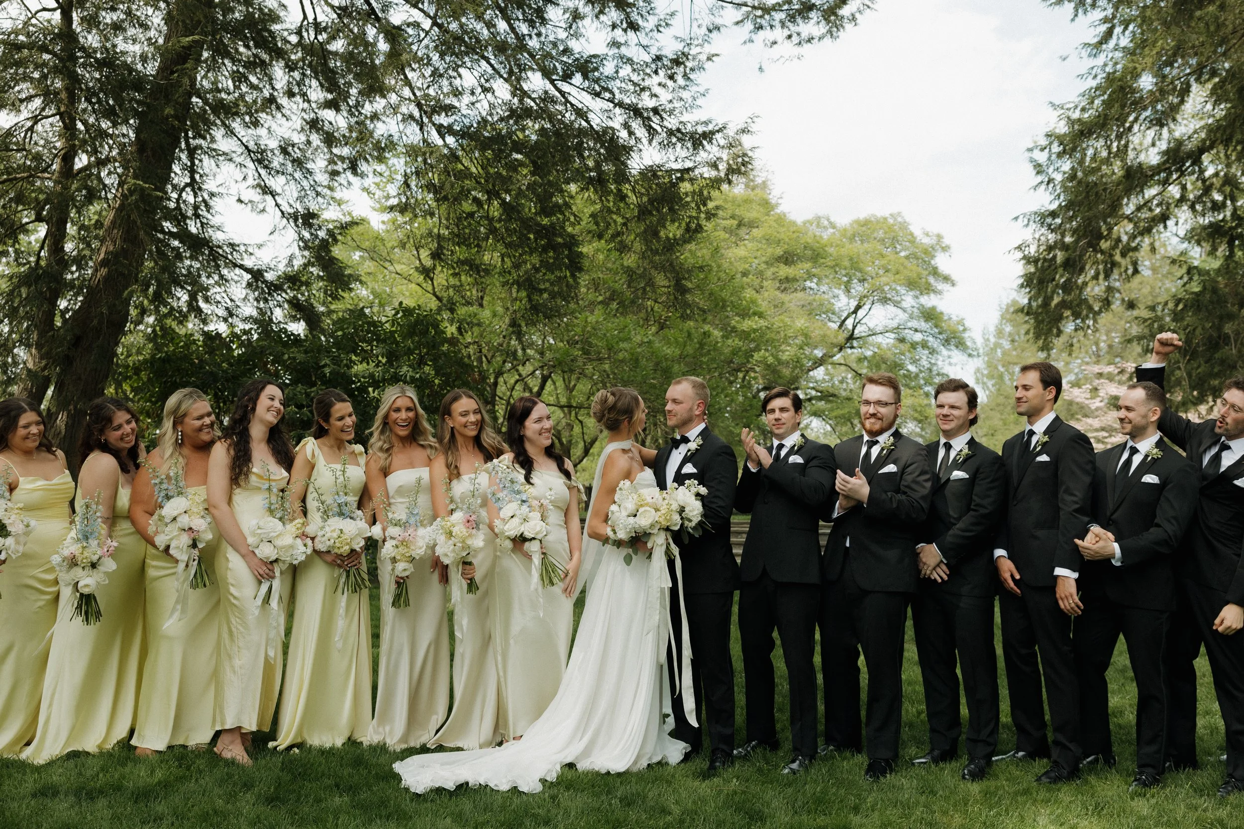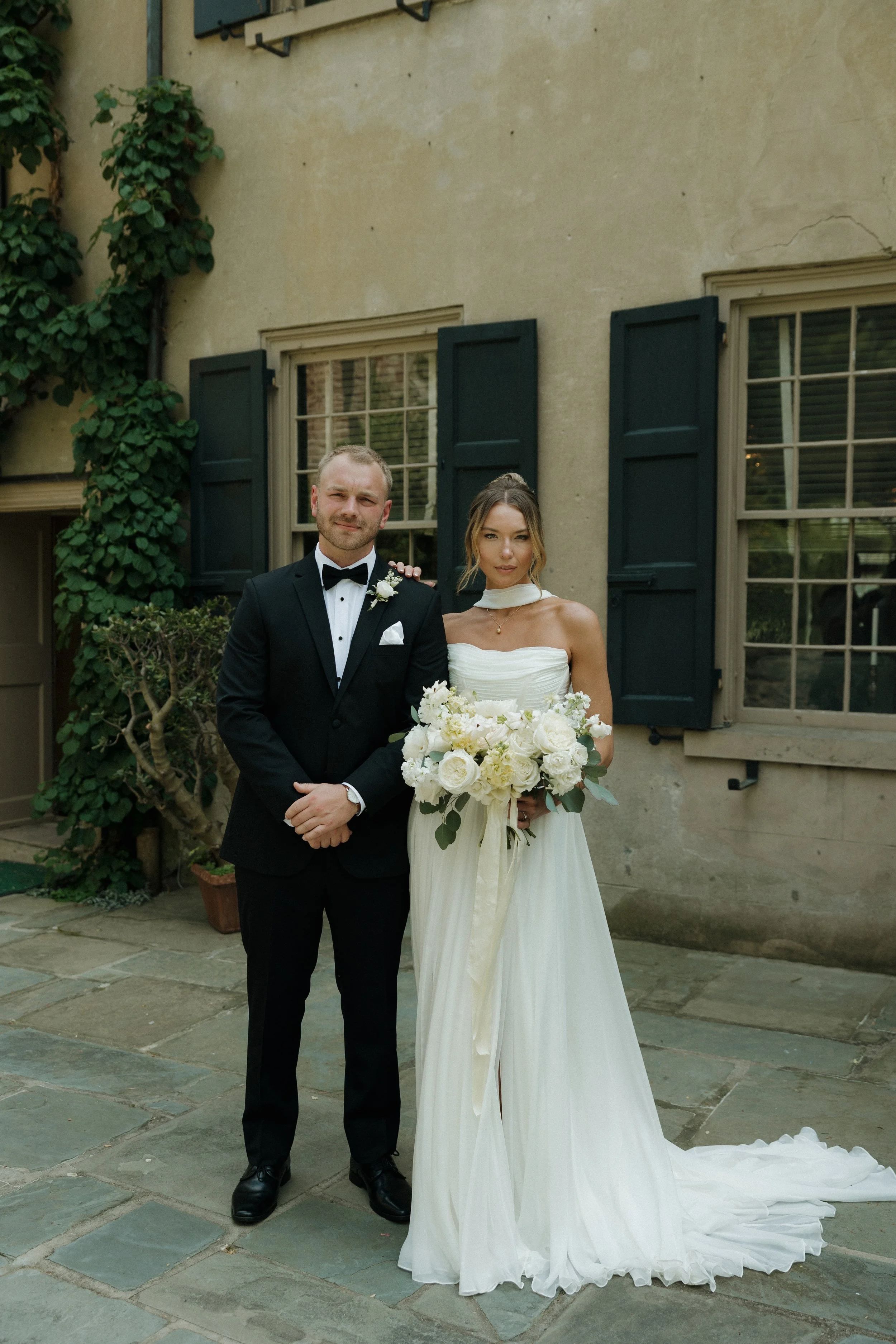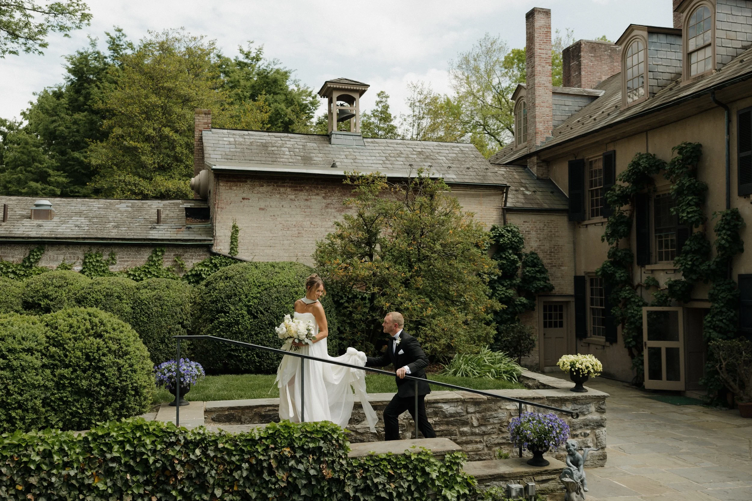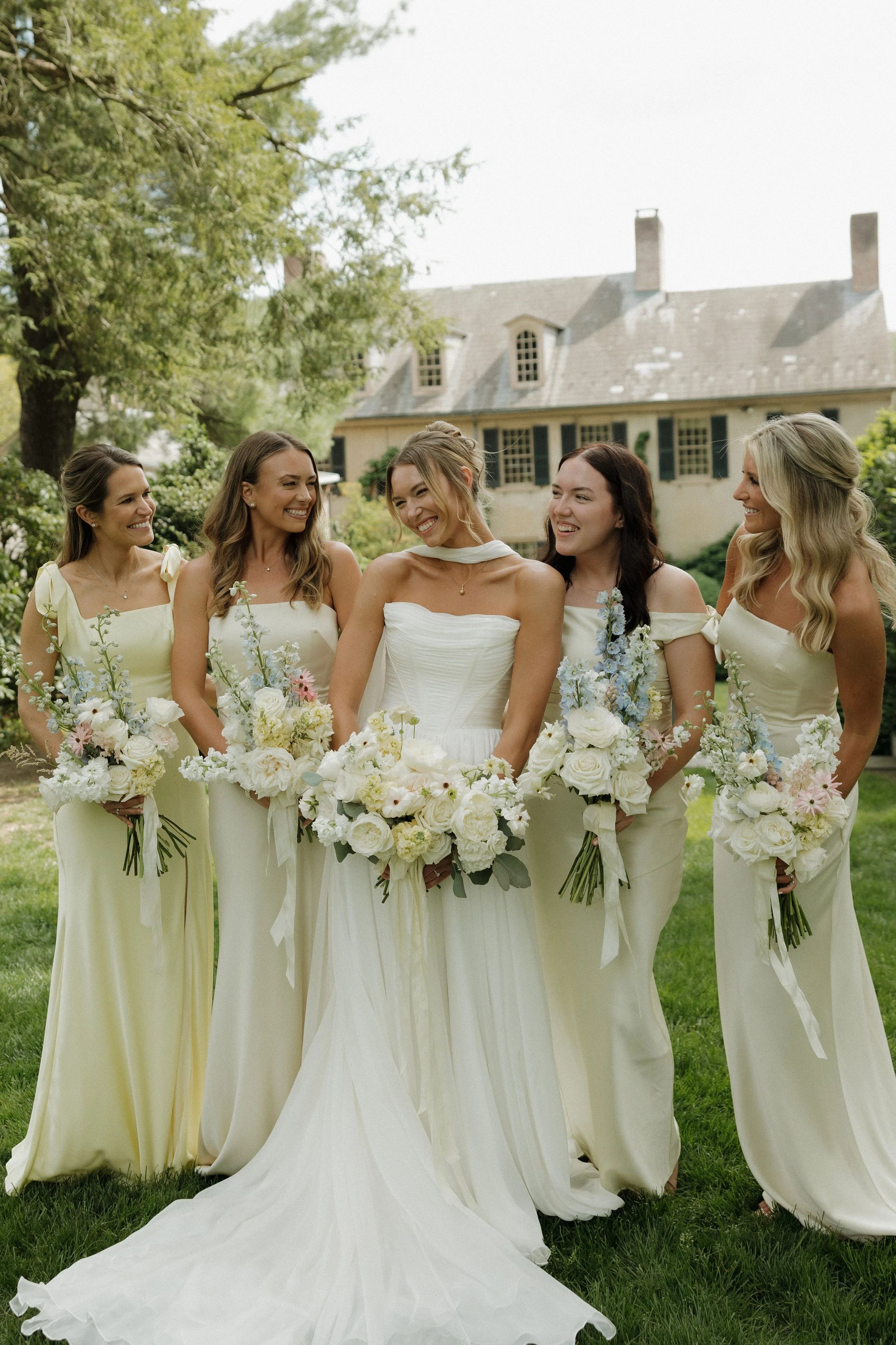 The morning unfolded at the historic Conestoga House & Gardens, where sunlit rooms set a gentle, anticipatory tone. Bridesmaids in butter-yellow dresses wandered the gardens with pastel bouquets in hand. The Bride and Groom walked side by side, calm and present before their vows.