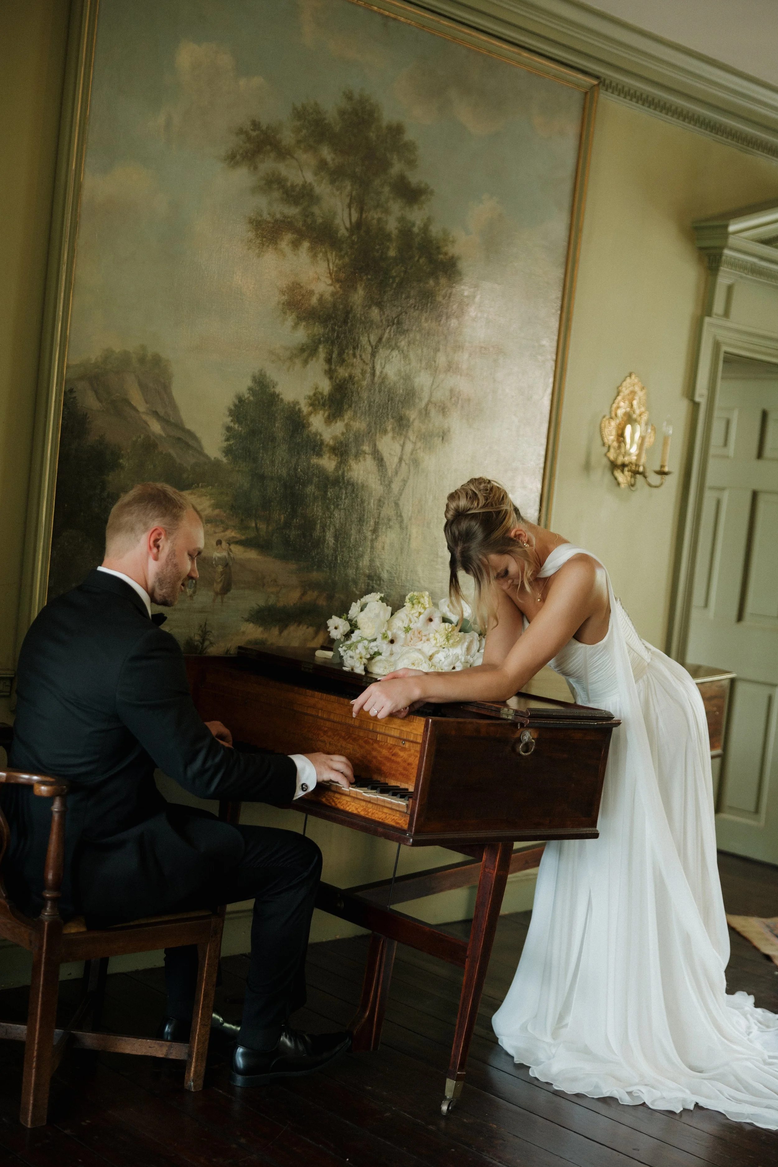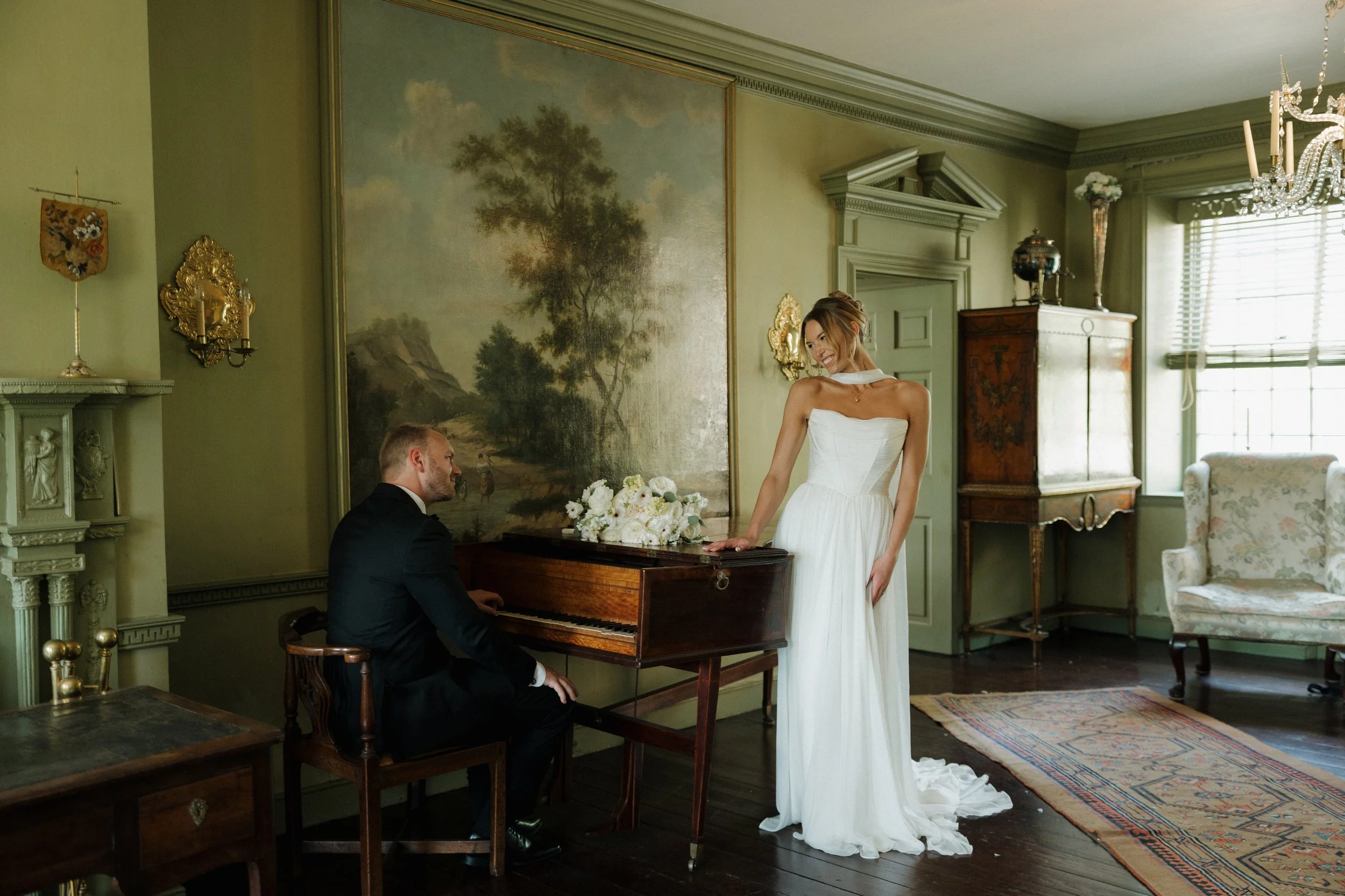 The ballroom shifted seamlessly into an intimate banquet-style dinner by candlelight. Tables glowed beneath antique chandeliers, florals and taper candles creating layers of golden light. Conversation flowed, toasts rose, and the atmosphere grew more celebratory until the music led everyone to the dance floor. Under chandeliers and the wash of amber light, guests danced the night away in a scene that could have been lifted from a scene out of Pride and Prejudice.